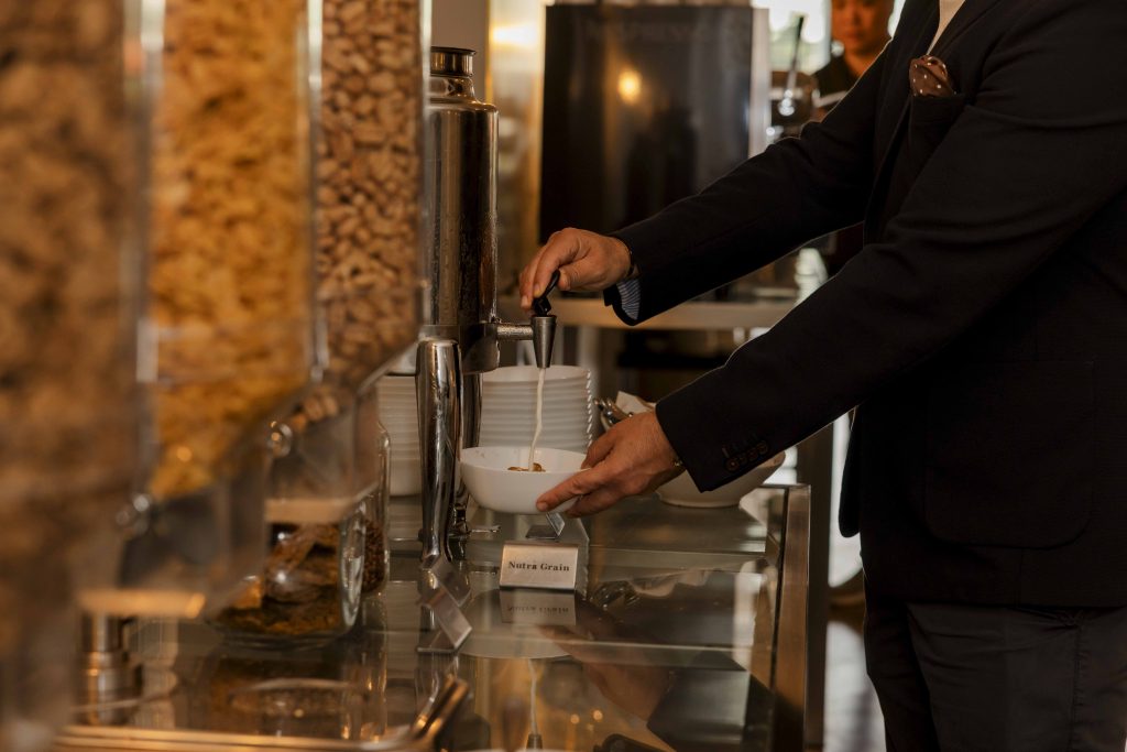 Enjoy a selection of refreshing fruit juices, assorted bakery items served with preserves, and freshly brewed Nespresso coffee. The buffet also features seasonal fresh-cut fruit, yoghurt with a variety of compotes, and a hearty hot selection including fluffy scrambled eggs, crispy bacon, sausages, golden hash browns, baked beans and grilled mushrooms.